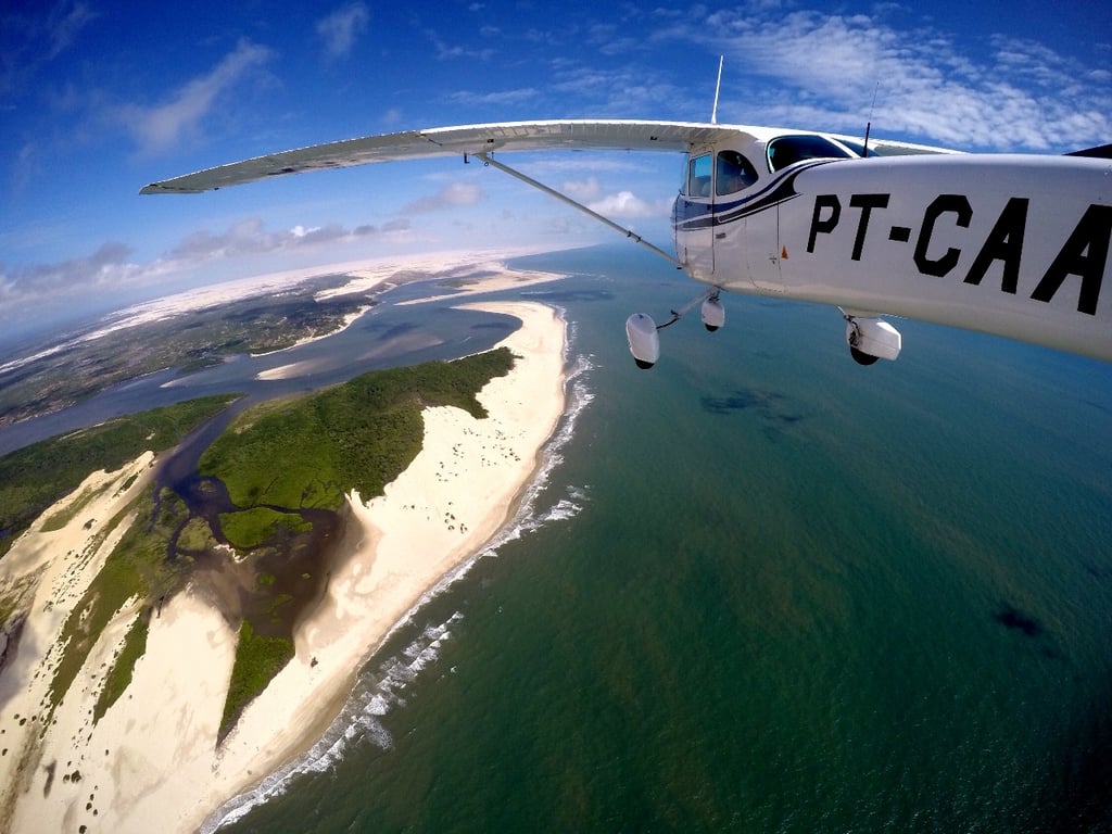 intocada dos Pequenos Lençóis, sobrevoando vilas pitorescas como Mandacaru, o paraíso dual de Caburé (entre o rio e o mar) e a vila boêmia de Atins. O espetáculo final fica por conta do sobrevoo pela Lagoa Azul. Uma jornada aérea que revela a diversidade e a beleza serena do litoral dos Lençóis.